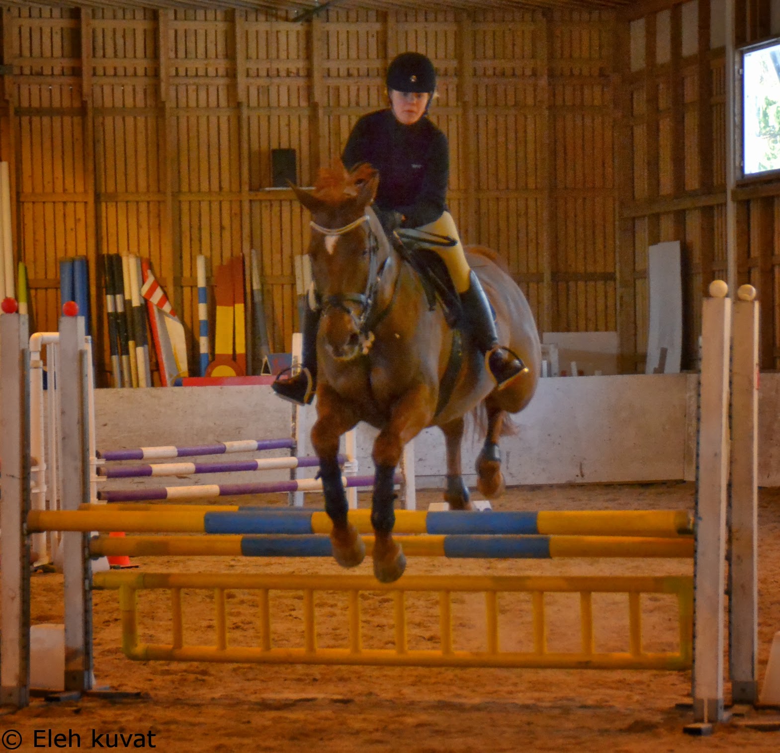 Radalla sain hyvän fiiliksen, se kuskaili vähän, mutta ei pahasti. Sain sen kivasti 1,2,3 sitten 4 tuli alas, se kuskaili ehkä vähän, otin pidätteen ja päästin sen ehkä liian pitkäksi. No ei se tähän kaadu jatkoin matkaa 5,6 väli tuli hyvin. Sen jälkeen oli sarja ja jäin aivan liikaa nyppimään ohjasta niin eiköhän a-osa tullut alas... 8 tultiin ihan hyvin yli. Ärsyttää varsinkin tuo sarjan a osa... Koska olisin voinut jättää sen pudottamatta.. Mutta eihän sille voi mitään. Hypättiin myöhemmin vielä rata isompana, siinä oli ihan rata, jos ei lasketa mukaan omaa mokaa.